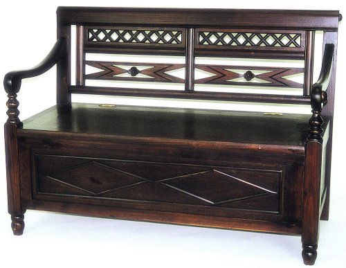 Country Storage Bench?Indonesian bench with Dutch colonial design elements. Rich dark stain wood finish. Block frame, lathe turned baluster feet and arm supports, and carved scroll armrests. Elaborate carved Sumatran ornamentation on seatback. Hinged seat provides practical storage in base, which features a carved diamond design.