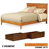 | ✚✚✚ Monterey Platform Bed Queen with Open Foot Rail with 2 Flat Panel Bed Drawers (Caramel Latte) (45.88"H x 65.25"W x 84.63"D) This Caramel Latte Monterey Platform Bed Queen with Open Foot Rail with 2 Flat Panel Bed Drawers by Atlantic Furniture features a traditional, transitional anchored appearance, a classic raised panel, eco-friendly hardwood headboard and crown molding. The Monterey Platform Bed is a visual delight as well as offering a dynamic, durable, dependable bedroom experience, night after night! The Monterey has an adjustable height design which allows you to use with or without a mattress and foundation, and it has been wisely designed to accept underbed storage drawers or a trundle bed. The metal hook and rail system makes this the well-crafted Monterey strong, reliable, and easy to assemble. Featuring solid hardwood construction with solid hardwood bed slats, the Monterey Platform Bed by Atlantic Furniture is built to last. Assembly level/degree of difficulty: Easy.