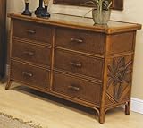 | ✚✚✚ Six Drawer Dresser TC Antique This Cancun Palm bedroom collection is one of our exclusive and largest collections of fine rattan and herringbone wicker weaving. That has a fiber palm tree castings design. The woven leather bindings used throughout Cancun Palm ensures its durability and quality for many years of use. It enhances the tropical look in any bedroom room. In addition metal glides are used on all the case good pieces. The bedroom case pieces have an optional piece of glass that is sold seperately.DiningBarstool Items aswellFully AssembledMetal Glides for the drawersTropical island style design with palm tree décorOptional Glass is available for dressernighstandand chestsOverall dimensions 35"H x 52"W x 22"DFinish Antique FinishAssembly Required NHeight 35Width 52Length 22