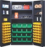 Heavy Duty Bin Cabinet Gray 36 x 24 x 72, 2 Adjustable Shelves, 64 YELLOW Bins. Standard performance features: ships completely assembled, ready to use, 14 gauge all-welded construction,. gray baked-enamel finish which ensures years of heavy duty service. 3 point locking handle supplied with 2 keys. Bins are available in Blue, Yellow, Green, Red, Ivory and BlackAll-Purpose cabinets provide secure storage for your valuable parts and tools Standard performance features: ships completely assembled, ready to use, 14 gauge all-welded construction, gray baked-enamel finish which ensures years of heavy duty service 3 point locking handle supplied with 2 keys Bins are available in Blue, Yellow, Green, Red, Ivory and Black