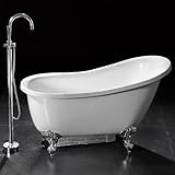 | ✚✚✚ 51" Victorian Acrylic Slipper Clawfoot Tub - Continuous Rolled Rim - Polished Brass Imperial Feet This acrylic clawfoot slipper bathtub is the perfect upgrade to fit into a standard bathtub space. Its body and claw feet make a welcome addition to any home. Continuous rolled rim acrylic tub with Imperial style feet. Available without faucet holes for use with a freestanding tub filler or faucet mounted on the bathroom wall. Overall tub dimensions: 51 L x 26-1/4 W (front to back) x 32-1/8 H (± 1/2 ). Tub is made of two acrylic sheets. Space between walls of tub is partially filled with fiberglass and resin for added durability. Tub does not have an overflow. Compatible with the drains sold below. Cast aluminum feet have built-in adjusters for use on uneven floors. Tubs are delivered by truck, to your residence, to your curb. The trucking company will call ahead to confirm delivery with you. Includes crate charge, shipping, and lift gate service within the contiguous 48 states. UPC certified.